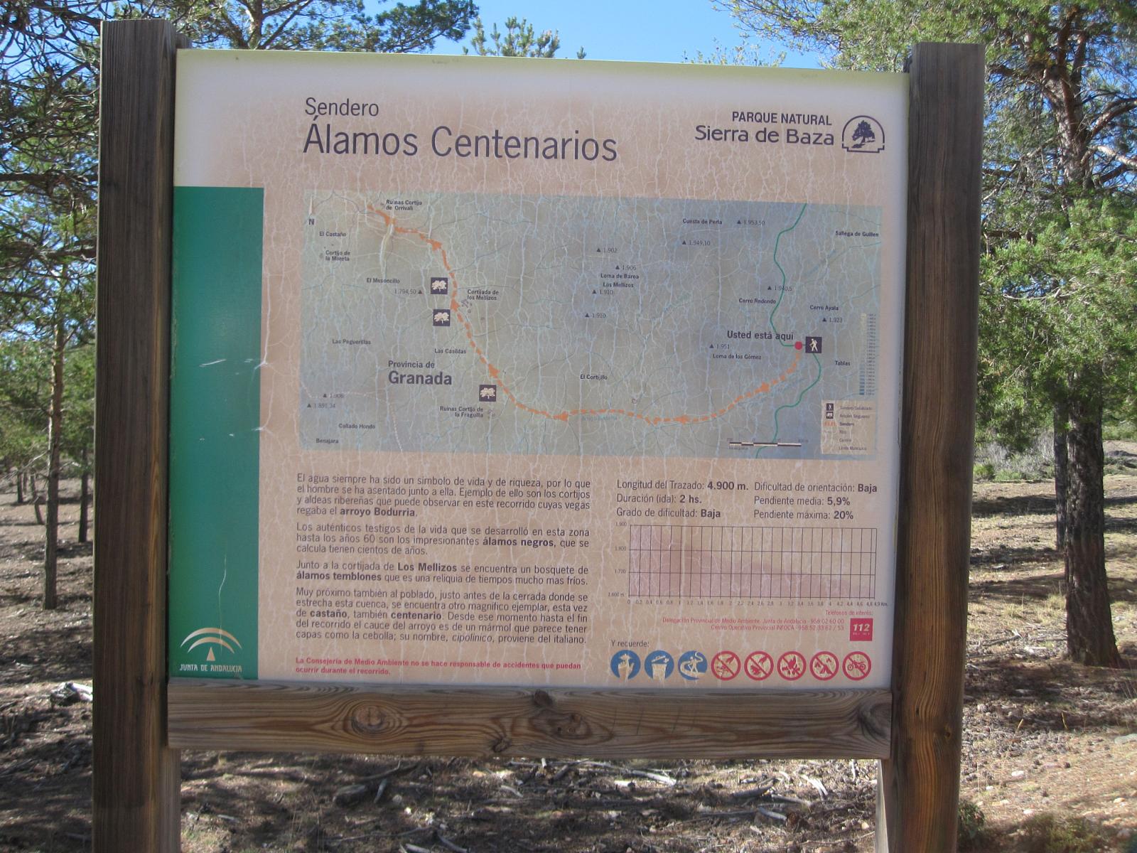 Salimos del hotel y nos dirigimos hacia el inicio de la ruta situado en la carretera límite de provincia entre Granada y Almería, camino de Caniles a Abla, (68km, 1 hora). Dejamos los vehículos junto al cartel de inicio del sendero . En suave y progresiva bajada nos dirigimos en paralelo por el Barranco del Aguardentero y seguimos el camino pasando por los siguientes puntos: Cortijo de la Canaleja, Abrevadero de la Fraguilla, Arroyo de Bodurria, Alamos Centenarios, Ruinas y Cementerio de los Mellizos, Castaño Centenario, Bosque de Cedros, Arroyo de Bodurria, Ruinas de Casas y Molino de Santa Olalla, Mirador de Barea y punto de inicio de la ruta.