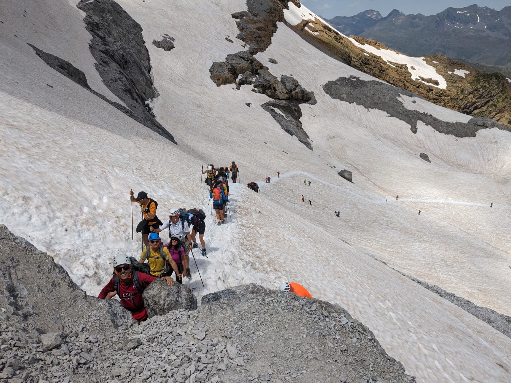 Después de desayunar en el refugio, cogemos el GR11 en la misma dirección por la que llegamos ayer, nos desviamos hacia el Paso de los Sarrios para llegar a la Brecha de Rolando por el lado español, si tenemos tiempo y fuerzas nos podemos desviar para hacer el Taillón ida y vuelta, bajamos hacia el refugio de la Brecha para llegar después al Puerto de Bujaruelo, donde seguiremos bajando hasta llegar el Puerto Romano de Bujaruelo, donde un taxi nos llevará a nuestro hotel en Torla.