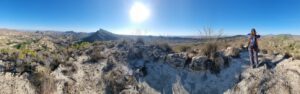 Pasaremos por el mirador de la Senda Bonita, desde donde tendremos unas impresionantes vistas del llamado Paisaje lunar, de Columbares y de Los Mamellones.