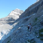 Seguimos la traza, evidente en su comienzo, pero menos clara poco después, para volver a definirse más adelante. Debemos realizar un flanqueo en el tramo menos marcado en el que se progresa con ayuda puntual de las manos, prestando atención a posibles resbalones y a caídas de piedras provenientes de la cresta y las paredes del Petit Vignemale. No es un tramo difícil pero debemos estar atentos (podemos evitar el tramo descendiendo por el GR 10, hasta la curva que da acceso a las Grottes Bellevue, para desviarse desde allí hacia el glaciar) Esta variante supone menor riesgo objetivo pero aumenta el desnivel de la actividad.