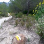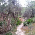 Nada más iniciar el descenso por pista, nos desviamos por sendero (para atajar y volver a ella más adelante), subimos un corto trecho y eludimos una valla abierta por la izquierda, nuevamente en pista llegamos rectos a un cruce entre limoneros, descendemos a una terraza de prado y cultivos abandonados, con dificultades de paso por la falta de uso, nos introduce en el Sendero de la Umbría, contrastando su exuberante cobertura vegetal, contra el escaso matorral de las vertientes de solana.